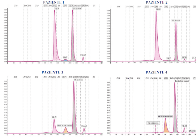 Paziente non trasfuso. Presenza di Hb S confermata con test di sickling dal 1°livello. Hb A2: avendo definito la presenza di una variante beta, l’evidente sdoppiamento dell’Hb A2 deve essere attribuito ad una mutazione dei geni δ. L’Hb S risulta in percentuale più bassa rispetto ai valori medi riscontrati per le varianti β, ciò può essere attribuito all’anemia sideropenica. L’anemia incide anche sulle quantità relative dell’Hb A2 e dell’Hb A2-X. La caratterizzazione molecolare dei difetti riscontrati conferma i dati del 1°livello ed evidenzia la presenza della variante δ più conosciuta e diffusa in Africa.