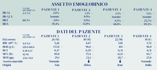 Con altri esempi, si torna qui sul significato da attribuire all’Hb A2, all’Hb F e all’MCV ridotto in relazione all’eventuale co-ereditarietà di difetti β talassemici quando sono presenti varianti delle catene β globiniche. In particolare, a tale proposito ci chiediamo: