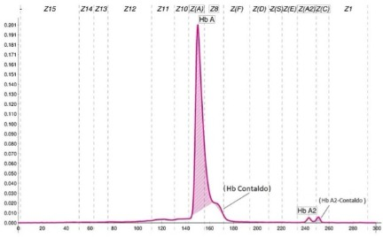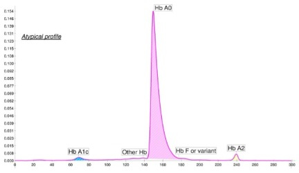 •La variante non si separa nettamente da Hb A e si presenta in quantità inferiore al 10%, tale quantità è significativamente bassa nonostante la presenza dell’α-talassemia.