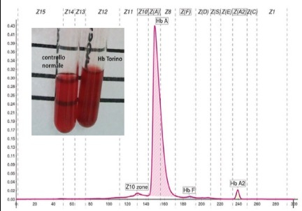 •Il profilo elettroforetico ottenuto per la misura dell’Hb A1c ne ha evidenziato un valore significativamente basso (12 mmoli/moli), dovuto alla ridotta sopravvivenza eritrocitaria dell’Hb Torino.